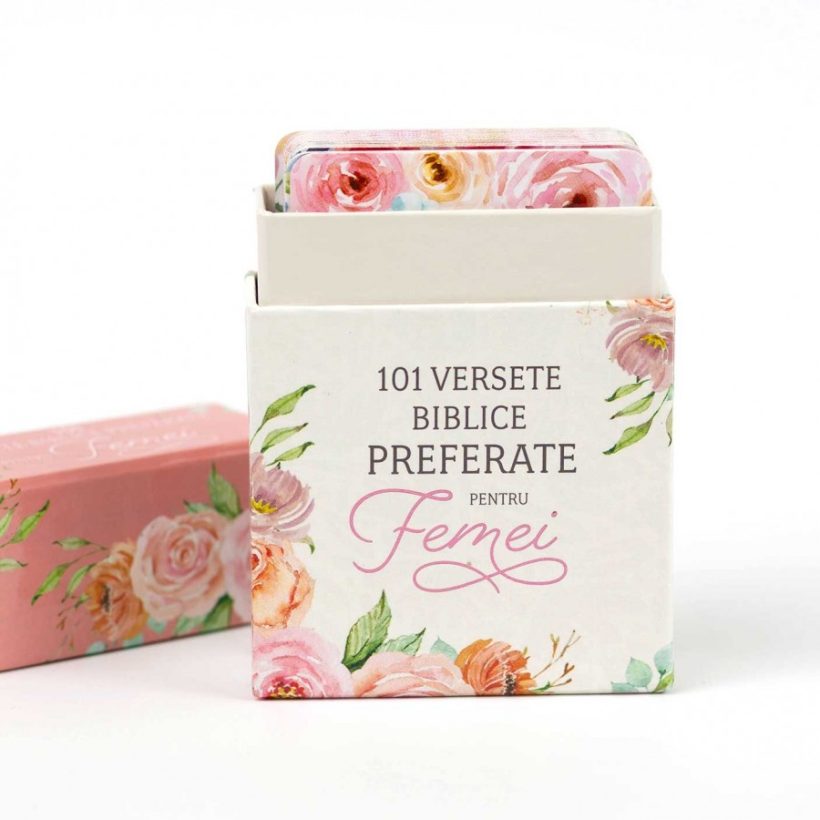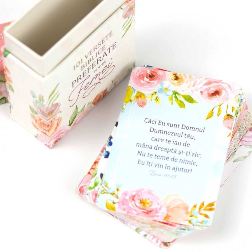 101 Versete Biblice Preferate pentru Femei conține 51 de carduri față-verso cu versete biblice pe ambele părți. Ambele părți ale cardurilor sunt tipărite în culori pline și prezintă un cadru floral frumos colorat în jurul versetelor biblice.